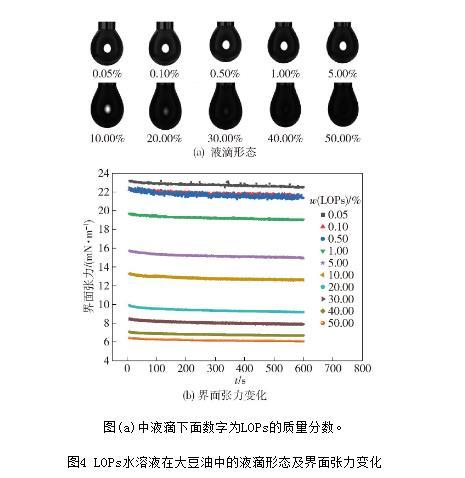 圖4 LOPs水溶液在大豆油中的液滴形態及界面張力變化