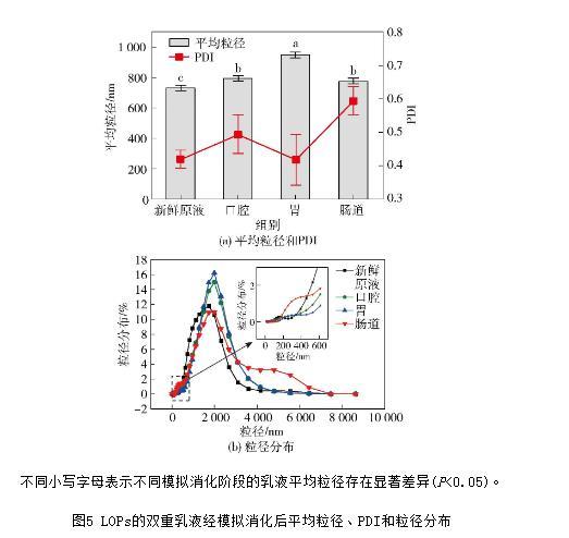 圖5 LOPs的雙重乳液經模擬消化后平均粒徑、PDI和粒徑分布