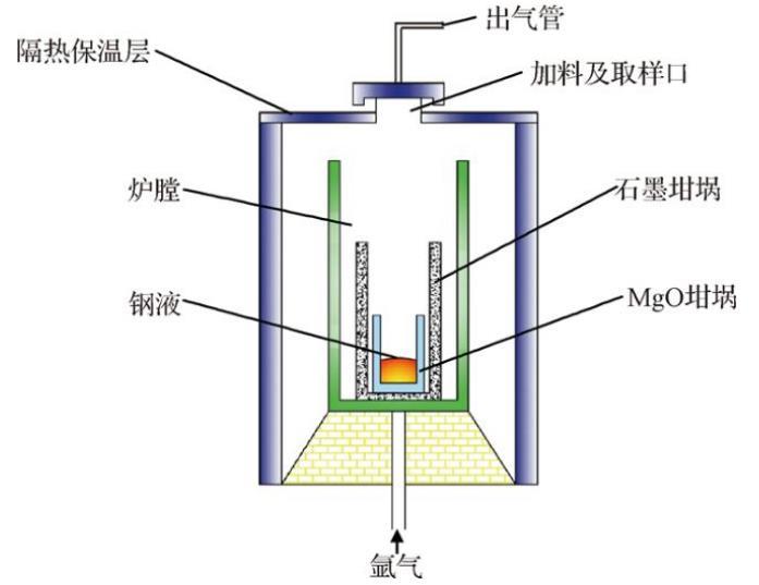 將重軌鋼鑄坯切成20 mm×15 mm×10 mm的鋼塊并打磨氧化皮,每爐試驗取約300 g鋼塊疊放在MgO質量分數為99.5%的坩堝中,并隨石墨坩堝一同放置在管式電阻爐中,調好程序緩慢加熱升溫,試驗裝置如圖1所示。當溫度升至600℃時,氬氣(質量分數為99.99%)流量控制為2.5 L/min,保持坩堝內中性氣氛,當溫度升至900℃時,氬氣流量調整為3.5 L/min,爐膛升溫至1 600℃后持續保溫30 min以保證鋼液熔化且均勻。