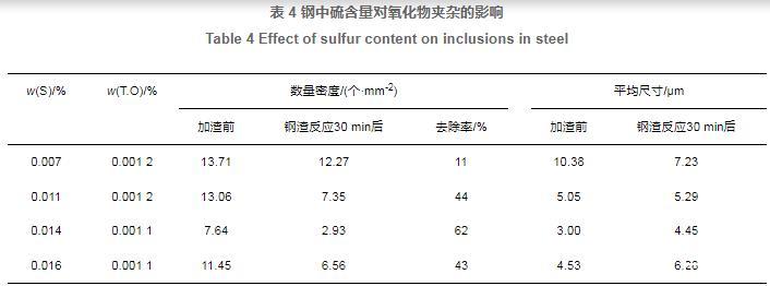 分析ASPEX全自動夾雜物分析儀掃描結(jié)果,定義MnS質(zhì)量分?jǐn)?shù)小于10%的夾雜物為氧化物夾雜。關(guān)注鋼渣反應(yīng)前后氧化物夾雜的數(shù)量密度和平均尺寸,統(tǒng)計(jì)結(jié)果見表4、表5和圖4~圖7。可以看出,鋼中氧、硫含量的提高對鋼渣反應(yīng)過程中氧化物夾雜去除有顯著的效果。隨著氧、硫質(zhì)量分?jǐn)?shù)增加,氧化物夾雜的去除率呈升高趨勢,平均尺寸呈減小趨勢。在氧質(zhì)量分?jǐn)?shù)為約0.001 2%的前提下,鋼中硫質(zhì)量分?jǐn)?shù)從0.007%上升到0.016%時(shí),氧化物夾雜的去除率從10%上升到60%左右;在鋼中硫質(zhì)量分?jǐn)?shù)為0.007%的前提下,鋼中全氧質(zhì)量分?jǐn)?shù)從0.001 2%上升到0.004 4%,氧化物夾雜的去除率從10%上升到70%左右,氧化物夾雜的平均尺寸也呈減小趨勢。