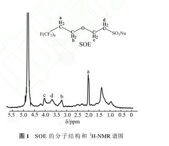 SOE的分子結(jié)構(gòu)和1H-NMR(D2O,400 MHz)譜圖如圖1所示。圖中SOE分子中所有氫的化學(xué)位移δ(ppm)如下:δa=2.02和δb=3.25分別為—CH2CH2O—中氫的化學(xué)位移,δc=4.03和δd=3.68分別為與磺酸離子直接相連的—CH2CH2—中氫的化學(xué)位移。溶劑(D2O)中殘余氫的δ為4.79。1H-NMR的表征結(jié)果說明樣品為目標產(chǎn)物。