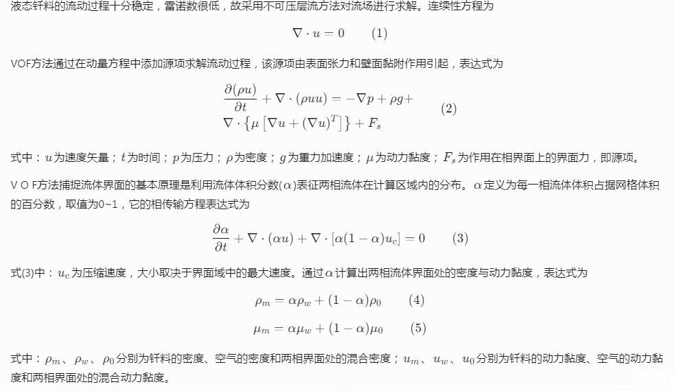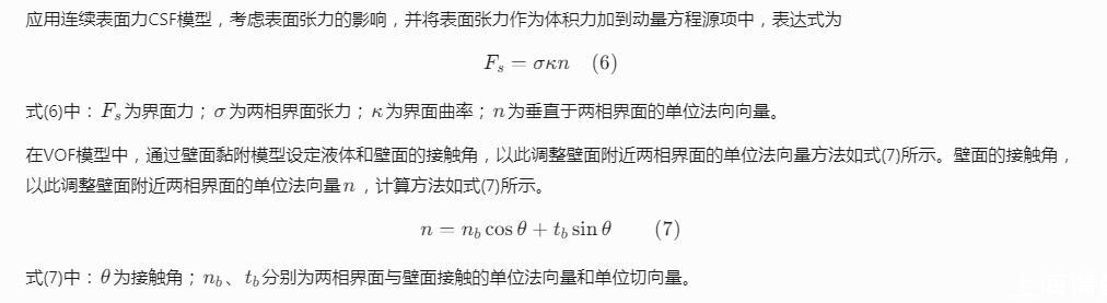 VOF方法通過在動量方程中添加源項(xiàng)求解流動過程,該源項(xiàng)由表面張力和壁面黏附作用引起,表達(dá)式為