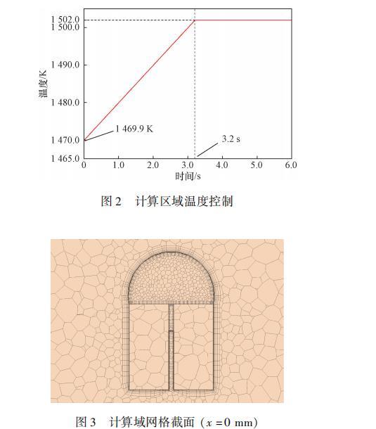 計(jì)算域網(wǎng)格截面(x=0mm)如圖3所示,整體上采用多面體網(wǎng)格,在釬料涂覆區(qū)域內(nèi)外均設(shè)置邊界層網(wǎng)格,為準(zhǔn)確捕捉多余釬料在母材表面的流失過程,對母材表面的網(wǎng)格進(jìn)行加密。