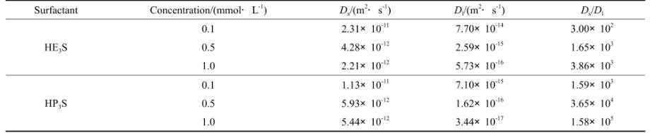 表2 HE3S和HP3S不同濃度水溶液的擴散系數及其比值