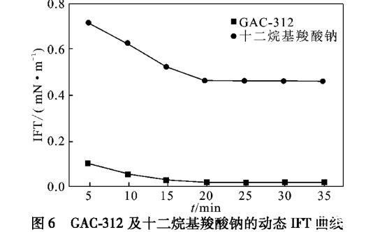 由圖6可知,羧酸鹽Gemini表面活性劑GAC-312在20 min內可將油水界面張力降至7.6×10-3mN/m(超低界面張力級別),相同條件下,十二烷基羧酸鈉將界面張力僅降低至4.54×10-1mN/m,GAC-312界面活性優異。GAC-312能夠具備優秀的界面活性主要是由于羧基和水之間具有較強親和力,導致GAC-312可以更快、更好地吸附在界面上,其分子在油/水界面上的排列更緊密,降低油水界面張力的能力更強。