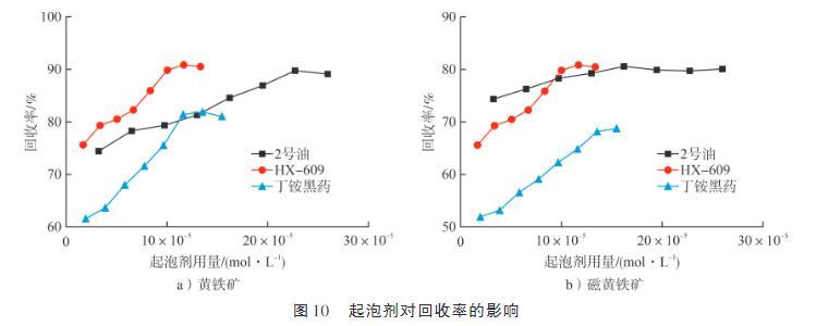 由圖10可知:在起泡劑用量相同條件下,HX-609在提升黃鐵礦回收率方面的效果顯著優(yōu)于另外兩種起泡劑。對(duì)于磁黃鐵礦而言,2號(hào)油與HX-609的浮選效果相當(dāng)。然而,從藥劑成本角度考量,2號(hào)油更具有優(yōu)勢(shì)。