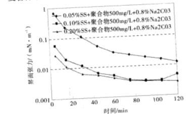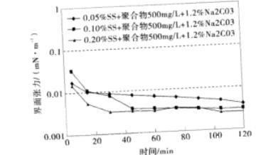 圖1石油磺酸鹽+聚合物500 mg/L+1.2%Na2CO3復配體系的動態界面張力(mN/m)