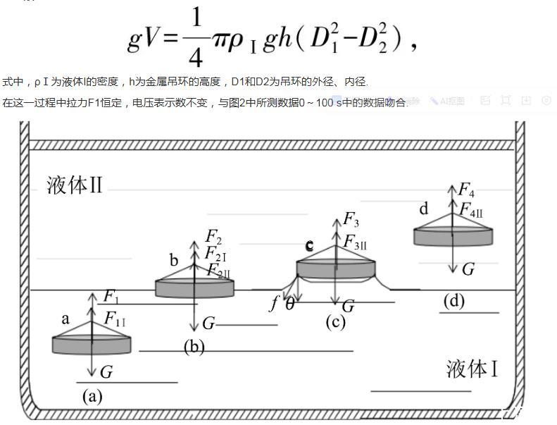 2)金屬吊環(huán)從液體Ⅰ中進(jìn)入液體Ⅱ中