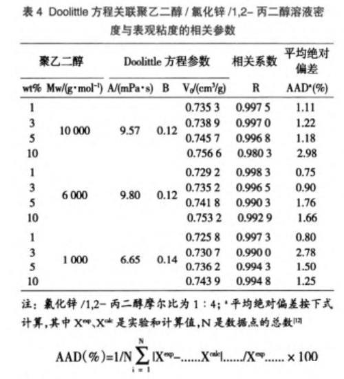表4 Doolittle方程關聯(lián)聚乙二醇/氯化鋅/1,2-丙二醇溶液密度與表觀粘度的相關參數(shù)