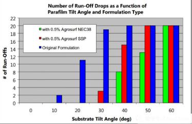 原始配方中超過一半以上的液滴在20°的傾斜角滾落,40°時(shí),全部液滴滾落。Agrosurf NEC38比Agrosurf SSP更有效,可防止所有液滴在30°時(shí)滾落,避免60%的液滴在40°滾落??蛻艨筛鶕?jù)這種方法,尋找更加優(yōu)異的表面活性劑。