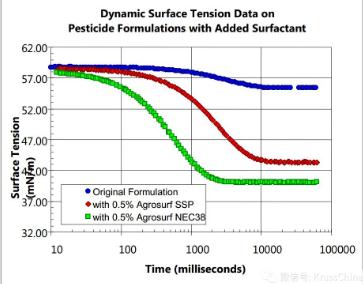 我們分別用Kibron動(dòng)態(tài)表面張力儀,DSA100液滴形狀分析儀,從動(dòng)態(tài)表面張力,接觸角和滾動(dòng)角的角度,來全面衡量和評價(jià)0.5wt%的Agrosurf SSP、0.5wt%的Agrosurf NEC38對農(nóng)藥的噴灑效果。