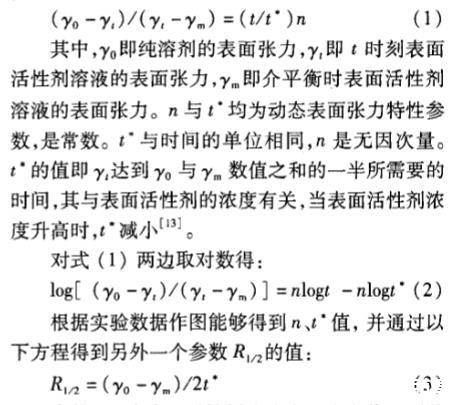 其中,即純?nèi)軇┑谋砻鎻埩?,即t時(shí)刻表面活性劑溶液的表面張力,即介平衡時(shí)表面活性劑溶液的表面張力。n與t均為動態(tài)表面張力特性參數(shù),是常數(shù)。t與時(shí)間的單位相同,n是無因次量。t的值即達(dá)到。與7數(shù)值之和的一半所需要的時(shí)間,其與表面活性劑的濃度有關(guān),當(dāng)表面活性劑濃度升高時(shí),t減小。
