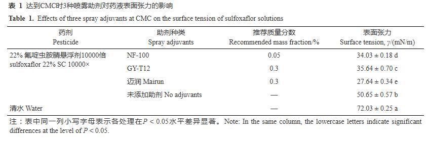 當溶液中的表面活性物質的質量濃度達到其CMC時,液體具有良好的吸附和潤濕性,因此確定助劑的最低施用濃度以大于等于其CMC為依據。3種噴霧助劑的CMC測定結果見圖1。NF-100、GY-T12和邁潤3種噴霧助劑的CMC的對數值分別為2.40、3.43和3.46,得到其CMC分別為250、2708和2877 mg/L,其中糖基類表面活性劑NF-100具有更低的CMC,比另外兩種低一個數量級。根據助劑添加量應適當大于其CMC的原則,考慮量取方便,將NF-100的添加量確定為500 mg/L、折算為質量分數0.05%,將GY-T12和邁潤的添加量確定為3000 mg/L、折算為質量分數0.3%。在此添加量下,測定了3種噴霧助劑對氟啶蟲胺腈藥液表面張力的影響。結果(表1)表明,添加NF-100、GY-T12和邁潤3種助劑后,氟啶蟲胺腈藥液的表面張力顯著降低,由未添加助劑時的50.65 mN/m分別降低至34.03、35.64和27.64 mN/m,其中邁潤對藥液表面張力的降低效果最顯著,3種助劑之間均存在顯著差異(P<0.05)。