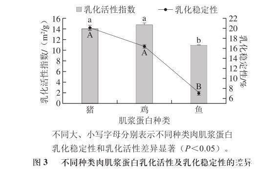 實(shí)驗(yàn)結(jié)果還表明,雞肉肌漿蛋白乳化活性最高,魚(yú)肉肌漿蛋白乳化活性顯著低于豬肉和雞肉肌漿蛋白,豬肉肌漿蛋白乳化活性稍低于雞肉但無(wú)顯著差異性,這可能是由于肌漿蛋白粒徑及構(gòu)象的不同造成的。但魚(yú)肉肌漿蛋白的乳化穩(wěn)定性顯著最差。