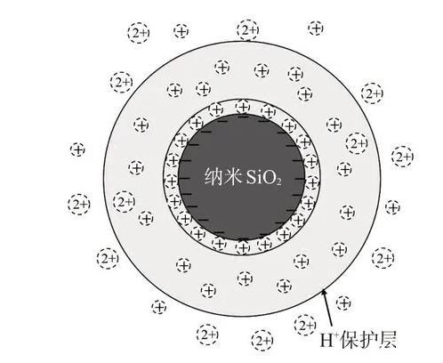 SiO2表面的羥基會和H+發(fā)生反應(yīng),所以和Ca2+、Mg2+、Na+離子相比,H+更容易吸附在納米顆粒表面。當體系中含有足夠量的H+時,H+離子可以在納米SiO2周圍形成保護層,如圖4所示。模擬地層水中極少量的二價Ca2+、Mg2+也會使納米SiO2失去穩(wěn)定性,H+保護層的存在降低了納米SiO2雙電層中二價離子的含量,從而減少了二價陽離子對納米SiO2穩(wěn)定性的破壞。