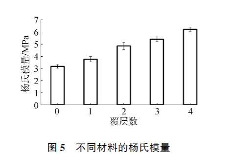 對(duì)羥基磷灰石和覆層材料的楊氏模量進(jìn)行了測(cè)量,結(jié)果如圖5所示??瞻椎牧u基磷灰石材料的楊氏模量為3.14±0.16 MPa,隨著覆層層數(shù)的增加楊氏模量逐漸增加,最高可達(dá)6.21±0.18 MPa,說(shuō)明膠原蛋白肽的覆層能夠有效地改善羥基磷灰石材料的力學(xué)性能,提高其楊氏模量。