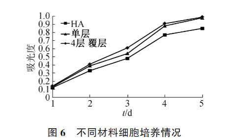 MC3T3-E1細(xì)胞在羥基磷灰石和覆層材料上培養(yǎng)5天的增殖情況見(jiàn)圖6。因結(jié)果類(lèi)似,圖中僅列出了單層和4層覆層材料的增殖結(jié)果,可以看出在覆層材料上MC3T3-E1細(xì)胞增殖要優(yōu)于空白羥基磷灰石材料,表明所制覆層材料不僅無(wú)細(xì)胞毒性,而且因膠原蛋白肽的優(yōu)良生物相容性,能一定程度上促進(jìn)細(xì)胞增殖。所用的羥基磷灰石和膠原蛋白肽都是經(jīng)過(guò)實(shí)踐證明的生物相容性良好的材料,其對(duì)材料生物性能的提升作用是由其本身的生物相容性良好引起的,因此覆層層數(shù)對(duì)生物性能提升作用不明顯。