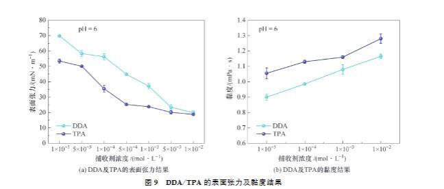 DDA及TPA的黏度結(jié)果如圖9(b)所示。由圖9(b)可知,弱酸性條件下,DDA或TPA的黏度均隨著捕收劑用量的增加而增大,這說明DDA或TPA均能增強(qiáng)溶液黏度。當(dāng)捕收劑濃度一致時,TPA的黏度總是大于DDA,這說明較高黏度的TPA具有更穩(wěn)定