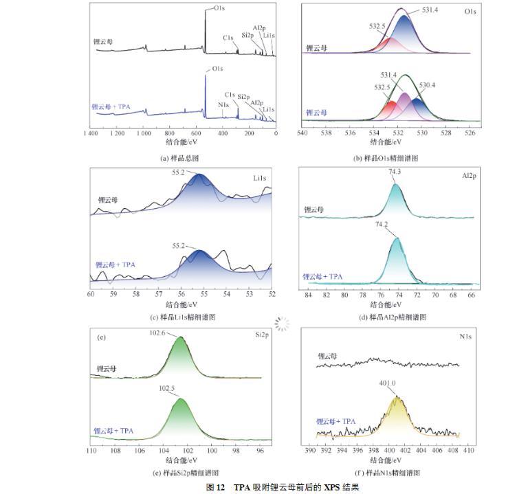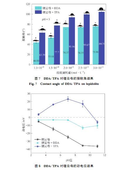 (2)接觸角試驗表明,同等條件下,TPA作用鋰云母的接觸角總是大于DDA,展現(xiàn)了TPA更強(qiáng)的疏水性。Zeta電位測試結(jié)果表明,TPA及DDA在鋰云母表面的吸附為靜電吸附,并且碳鏈更長的TPA由于疏水效應(yīng)吸附性更好,進(jìn)一步證明了TPA的強(qiáng)疏水性。FTIR及XPS進(jìn)一步證實了TPA吸附在鋰云母表面。