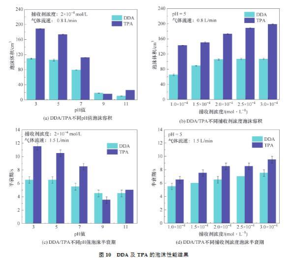 (3)在不同濃度下,TPA均得到比DDA更低的表面張力,說明TPA可能具有更多的泡沫容積,泡沫容積結(jié)果驗證了表面張力結(jié)果。在不同濃度下,TPA均得到比DDA更高的黏度,說明TPA產(chǎn)生的泡沫更穩(wěn)定,泡沫半衰期結(jié)果驗證了黏度結(jié)果。表面張力試驗、黏度試驗、泡沫容積試驗、泡沫半衰期試驗共同證明TPA更優(yōu)越的泡沫性能。將TPA應(yīng)用于浮選中,能夠增大氣泡與鋰云母的碰撞及接觸概率,增強(qiáng)鋰云母與氣泡的黏附,減少鋰云母與氣泡的脫附,進(jìn)而提高浮選回收率。