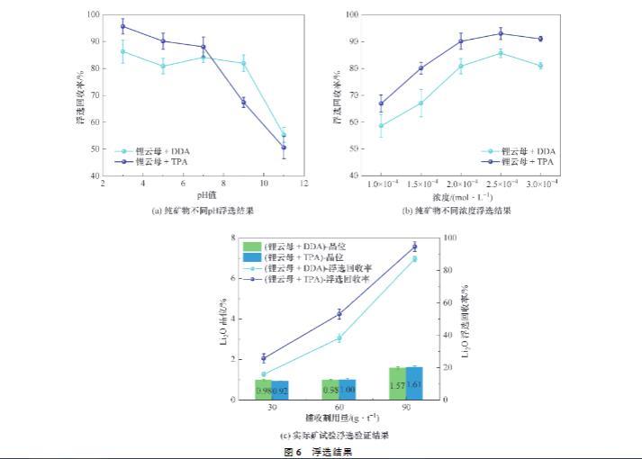 實際礦浮選試驗的檢測結(jié)果如圖6(c)所示,可以看出,在較小的捕收劑用量下,TPA或DDA作用后鋰云母精礦的品位相接近。但是,較高的產(chǎn)率使得TPA對鋰云母的浮選回收率高于DDA。實際礦檢測結(jié)果進(jìn)一步證明TPA浮選性能的優(yōu)越。此外,隨著藥劑用量的加大,DDA或TPA作用鋰云母的品位與回收率均會相應(yīng)提高。