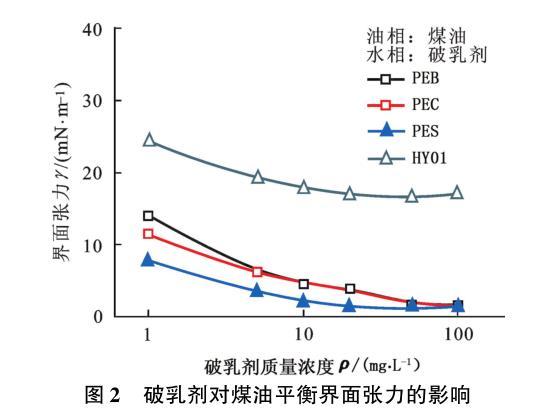 圖2破乳劑對煤油平衡界面張力的影響