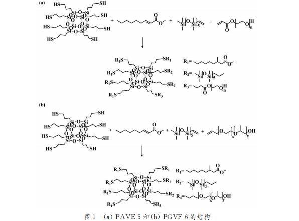 在已經(jīng)加入25mL二氯甲烷溶劑的50mL圓底燒瓶中加入定量組分的APEG400、VDMS和FEMA,進行混合溶解,最后加入1%(質(zhì)量分數(shù))的光引發(fā)劑溶解完全后進行封口處理,于溫度為30℃、攪拌速度為300r/min的條件下,放置于紫外燈(20W)照射45min,反應(yīng)結(jié)束后,旋蒸除去溶劑,最終得到無色透明、流動性明顯且富有粘稠狀態(tài)的液體產(chǎn)物POSS-APEG4001-VDMS2-FEMA5,簡稱為PAVE-5。同樣的方法改變其中之一的單體為APEG750,合成得到POSS-APEG7501-VDMS1-FEMA,簡稱PGVF-6。