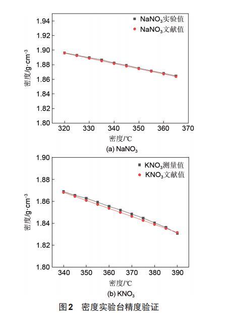 密度實驗臺精度驗證如圖2所示。密度實驗臺測得NaNO_3、KNO_3的密度與參考文獻上給出的密度值變化趨于一致,并且最大偏差值低于0.12%,考慮到文獻值存在的誤差,本實驗臺的密度測量精度滿足實驗要求。