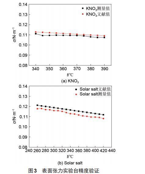本實驗先對NaNO3的表面張力進行測量,得到儀器系數C。由式(4)可知,儀器系數C與溫度無關,對NaNO3在5個溫度工況點下的表面張力進行測量,并且每個溫度工況點采集3次測實驗數據,通過最終的計算得到本實驗臺的儀器系數C=0.00053。對KNO和solar salt的表面張力進行測量后,與文獻值進行對比,如圖3所示。