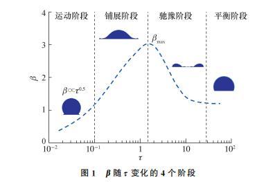 根據β隨τ變化情況,液滴碰撞分為運動、鋪展、弛豫和平衡4個階段,如圖1所示。在運動階段(τ<0.1),慣性力占主導地位,液滴上部仍保持球狀,下部鋪展成楔形邊緣,文指出該階段可忽略流體性質影響,β隨τ呈指數上升,即β∝τb,其中指數b介于0.45到0.57之間,一般取b=0.5;在鋪展階段,受黏性力或毛細力的主導作用,β逐漸增至βmax,然后液滴開始回撤收縮,進入馳豫階段;在平衡階段,液滴可能穩定鋪展,也可能發生反彈,或者碎裂飛濺。本文主要針對運動階段和鋪展階段進行研究。