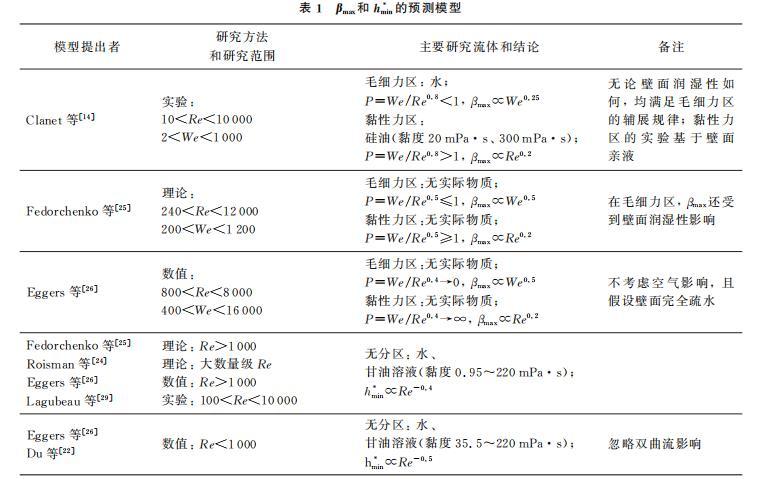 βmax和hmin*的多種預測模型如表1所示。從表1可以看出,在黏性力區,已有的理論、實驗和模擬研究普遍認為βmax主要由Re控制,與Re0.2成正比,但目前實驗數據和模擬驗證均較少,已有實驗主要針對硅油、甘油溶液,黏度在300 mPa·s以內,缺乏對于更高黏度液體的研究;另外,Eggers等的模擬研究不針對真實流體,且忽略空氣影響和假設壁面完全疏水,與現實情況具有差異。在毛細力區,盡管Eggers等的模擬結果與Fedorchenko等的理論相符合,都認為βmax∝We0.5,但Clanet等的實驗結果卻表明βmax∝We0.25,實驗所得We指數大小僅為理論的一半。因此,仍需對βmax進行更多的實驗、模擬研究。