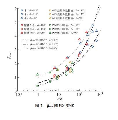 本文在毛細力區研究的流體包括水、60%質量分數甘油溶液、PDMS10硅油和鎵基合金,βmax隨We變化的情況如圖7所示。對不同潤濕性壁面的模擬結果進行擬合,如圖7中虛線所示:當θe=90°時,βmax∝We0.26(R2=0.921);當θe=180°時,βmax∝We0.40(R2=0.990);當θe=150°時,βmax∝We0.29(R2=0.918),介于前兩者之間。因為真實表面無法絕對疏水,所以Clanet等實驗研究結果βmax∝We0.25更接近本文θe=90°的模擬結果,而Eggers等針對完全疏水表面提出的βmax∝We0.5更適用于θe=180°的情況。