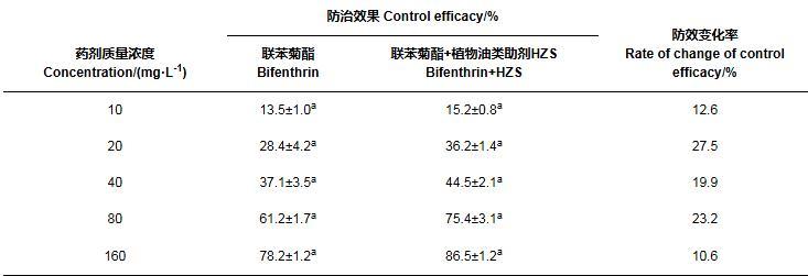 表6添加植物油類助劑HZS后100 g/L聯苯菊酯乳油對石斛菲盾蚧田間防效的變化