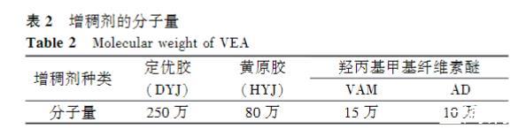 不同濃度的增稠劑溶液:采用增稠劑和去離子水配制不同濃度的溶液,其中DYJ和HYJ分子量較高,溶解性較差,需將去離子水適當(dāng)加熱至50℃,然后緩慢將稱好的增稠劑加入水中,并不停用玻璃攪拌棒進(jìn)行攪拌,直至完全溶解。