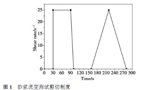 砂漿的流變測試使用Brookfield R/S SST2000流變儀,將測試流動(dòng)度之后的砂漿立即置于流變儀中,選定設(shè)置好的剪切制度后開始測試,剪切制度設(shè)置如圖1所示。具體過程描述如下:靜置30s后,在剪切速率25s?1下勻速預(yù)剪切60s;然后剪切速率在10s內(nèi)勻速下降至0s?1;靜置60s后,剪切速率以斜坡式在60s內(nèi)逐漸從0s?1提高至25s?1,然后再以斜坡式在60s從25s?1下降到0,采集60個(gè)數(shù)據(jù)點(diǎn)。采用剪切速率從25s?1下降到0s?1的過程中的屈服應(yīng)力和表觀黏度作為分析砂漿流變性能的數(shù)據(jù)。