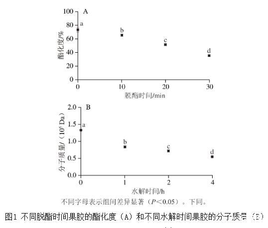 圖1不同脫酯時間果膠的酯化度(A)和不同水解時間果膠的分子質量(B)
