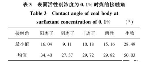以接觸角作為判斷潤濕的標準,接觸角越小則潤濕性能越好。表面活性劑濃度為0.1%時,煤巖接觸角統計結果見表3。當活性劑水溶液濃度為0.1%時,陰離子表面活性劑AES水溶液與煤的接觸角最小為9.11°。進一步將不同類型表面活性劑水溶液在濃度為0.1%時與煤的接觸角進行均值化處理可發現,陽離子、陰離子、非離子、兩性及生物表面活性劑水溶液與煤的接觸角平均值分別為34.4°、27.37°、29.72°、29.82°和50.03°。因此,表面活性劑潤濕性效果排序為:陰離子表面活性劑>非離子表面活性劑>兩性表面活性劑>陽離子表面活性劑>生物表面活性劑。