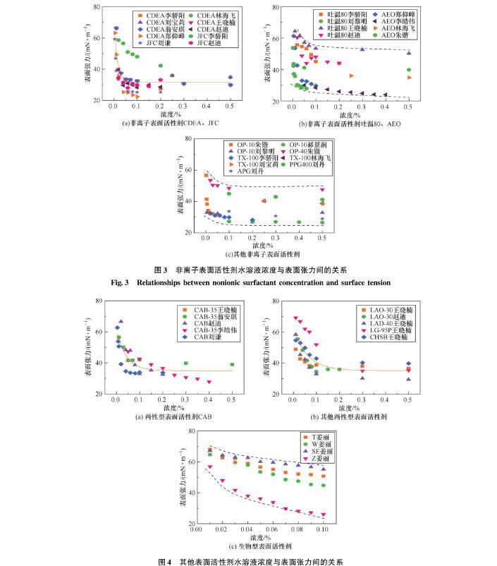 采用文獻調查法,匯總分析了82組不同類型表面活性劑水溶液濃度與表面張力的對應關系[19-34],如圖1~圖4所示。