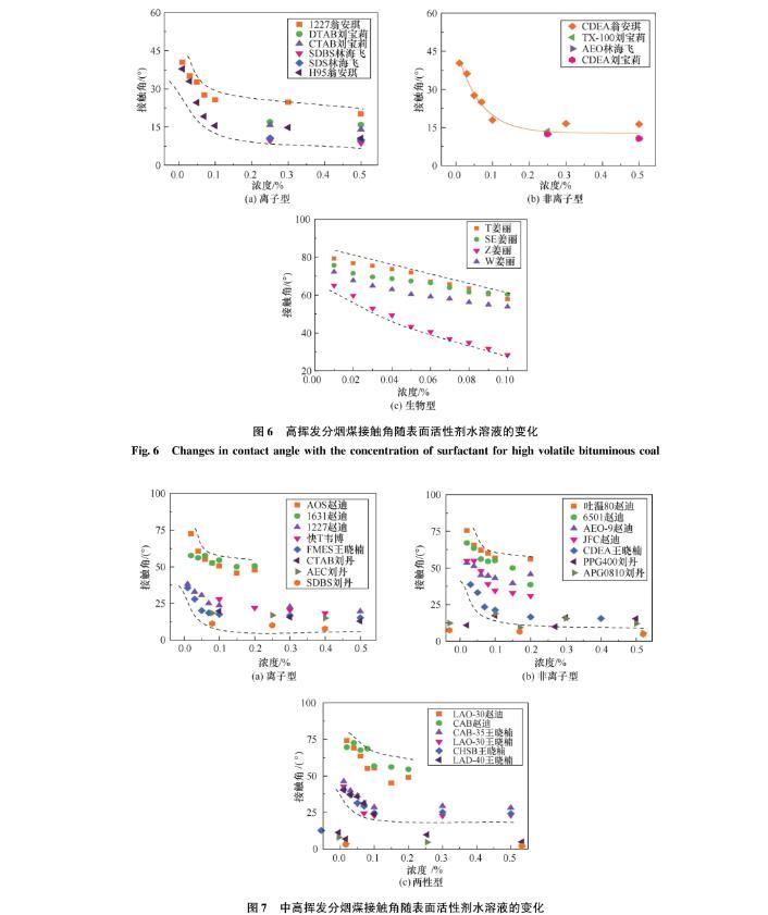 固體表面的潤濕性可用接觸角表征,反映了液體與固體表面相互作用的程度,接觸角隨液體表面張力的降低而不斷減小。由圖5至圖10可知,對于不同變質程度煤,離子、非離子和兩性型表面活性劑水溶液濃度小于0.1%時,接觸角隨濃度的增加而迅速降低。例如,圖7(b)所示的CDEA與中高揮發分煙煤間的接觸角從38.8°降低至21.2°。當表面活性劑水溶液濃度在0.1%~0.2%之間,接觸角的下降幅度明顯減緩;當濃度大于0.2%時,接觸角逐漸趨于穩定。整體而言,離子、非離子和兩性型表面活性劑水溶液在煤表面的接觸角隨溶液濃度的升高表現出降低趨勢,在濃度0.1%會出現明顯的拐點。而生物型表面活性劑水溶液與高揮發分煙煤間的接觸角隨濃度增大呈降低趨勢,且在試驗濃度0~0.1%范圍內的接觸角均大于25°。