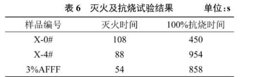 X-4#樣品泡沫具有高泡沫穩(wěn)定性,在以下研究中,著重研究X-4#與X-0#、3%AFFF相比的滅火及抗燒性能,測(cè)得的滅火時(shí)間及100%抗燒時(shí)間見(jiàn)表6。根據(jù)GB 15308—2006規(guī)定,滅火時(shí)間小于180 s,抗燒時(shí)間高于600s的泡沫被認(rèn)為具有成為消防泡沫滅火劑的潛力,X-4#樣品滅火時(shí)間88s、抗燒時(shí)間954 s,抗燒時(shí)間優(yōu)于3%AFFF,滅火時(shí)間比3%AFFF略高,但滿足消防用泡沫滅火劑性能要求,具有良好的消防滅火應(yīng)用潛力。