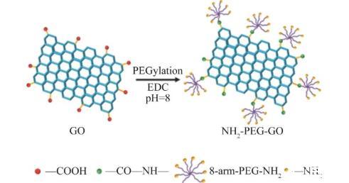 NH2-PEG-GO的制備方法:使用8-arm-PEG-NH2對(duì)GO表面進(jìn)行修飾(圖1)。取80 mL上述細(xì)胞破碎機(jī)處理后的GO溶液,加入16 mL質(zhì)量濃度為2 mg/mL EDC來活化GO表面羧基,然后將混合溶液在功率為570 W條件下超聲30 min(開1.5 s,關(guān)1 s),待分散均勻后,再用5%NaOH溶液來調(diào)節(jié)溶液酸堿性(pH=8),隨后將240 mg 8-arm-PEG-NH2加入,超聲反應(yīng)30 min后,再常溫?cái)嚢璺磻?yīng)12 h,離心水洗后得到氨基修飾的GO,于室溫真空冷凍干燥2 d后,得到最終產(chǎn)物,將產(chǎn)物研磨備用。
