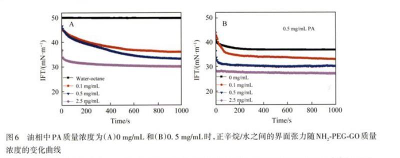 研究了PA和NH2-PEG-GO共存時(shí)界面張力的變化規(guī)律。測(cè)試了當(dāng)PA在油相中質(zhì)量濃度為0.5 mg/mL時(shí),NH2-PEG-GO質(zhì)量濃度變化對(duì)水-油界面張力的影響(圖6B),并與不添加PA時(shí)(圖6A)的情況進(jìn)行了對(duì)比。發(fā)現(xiàn)0.5 mg/mL PA的添加,使得界面張力平衡時(shí)間明顯縮短,從大約700 s縮短為小于200 s,并且PA的添加,使得0.1和0.5 mg/mL NH2-PEG-GO在t<300 s時(shí)的界面張力下降曲線發(fā)生變化,此時(shí)0.5 mg/mL NH2-PEG-GO條件下,界面張力值更低,界面張力平衡時(shí)間更短(圖6B)。這是由于在界面上優(yōu)先吸附的PA與NH2-PEG-GO之間存在靜電相互作用,PA上的羧基能夠吸引更多帶氨基的NH2-PEG-GO向界面吸附,使界面被更快、更有效地覆蓋,因此二者之間具有協(xié)同相互作用。但0.5 mg/mL PA的存在對(duì)由NH2-PEG-GO吸附引起的平衡界面張力僅比不添加PA時(shí)降低了約3 mN/m。這意味著界面張力的降低主要是由于NH2-PEG-GO吸附導(dǎo)致的。可以推測(cè),PA在水-油界面上更傾向于吸附到NH2-PEG-GO上,因此基本不影響平衡界面張力值。