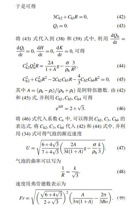 將具有簡單速度勢的Layzer模型和Zufiria模型推廣至非理想流體情況,并分別利用這兩種模型研究了界面張力對Rayleigh-Taylor不穩(wěn)定性的影響。首先得到了兩種模型下氣泡的漸近速度和漸近曲率的解析表達(dá)式;其次系統(tǒng)研究了界面張力對氣泡的漸近速度和漸近曲率的影響;最后將兩種模型進(jìn)行了比較,并將氣泡的漸近速度和數(shù)值模擬進(jìn)行了比較。研究表明:界面張力壓低了氣泡的速度,但對曲率沒有影響;利用簡單速度勢的Layzer模型所得的氣泡的漸近速度比復(fù)雜速度勢的Layzer模型的值小,但是比Zufiria模型的值大;當(dāng)阿特伍德數(shù)等于1時(shí),簡單速度勢的Layzer模型和復(fù)雜速度勢的Layzer模型給出的結(jié)果一致。