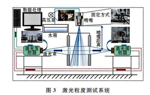 從圖3可知,噴霧粒徑測試主要儀器及工具包括激光粒度分析儀、高壓噴霧水泵、計算機(jī)分析控制系統(tǒng)等。計算機(jī)分析控制系統(tǒng)使用PAQXOS 4.1測量軟件,該軟件可定義、控制整個測量過程,并在試驗結(jié)束后處理測量的粒度分布數(shù)據(jù)。