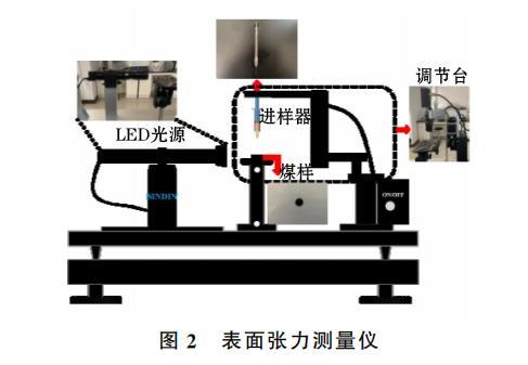 液體從噴嘴噴出初始階段,表面張力會對射流霧化產(chǎn)生阻礙作用,所以表面張力對噴霧場霧化性能有重要影響。測量表面張力時,調(diào)節(jié)樣品臺和光源在同一高度,在進(jìn)樣器中裝入1mL待測礦井水后滴至測量臺,待測溶液與測量臺接觸瞬間,開始捕捉液滴形態(tài)。測量完畢后,利用數(shù)據(jù)處理系統(tǒng)處理試驗數(shù)據(jù)與圖像。