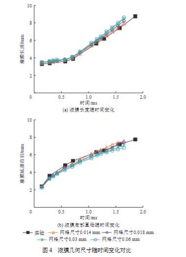 為了進行網格尺寸獨立性分析,在計算域尺寸為21 mm×66 mm時,將網格尺寸分別設置為0.06、0.03、0.018和0.014 mm。在實驗中的碰撞條件為顆粒直徑dp=3 mm,液滴直徑dd=3.93 mm,接觸角θ=168.4°,撞擊速度v0=4.17 m/s。在上述相同碰撞條件下,利用不同網格尺寸開展數值模擬,并測量不同時刻下液膜長度和液膜底部直徑的變化數據進行對比,如圖3所示。如圖4所示,隨著網格尺寸降低,數值模擬結果與實驗結果趨于重合。當21 mm×66 mm計算域的網格尺寸達到0.014 mm時,數值模擬結果與實驗結果之間的偏差低于5%,圖5a對比了網格尺寸為0.014 mm時模擬得出的液滴形態與實驗中拍攝的液滴形態,兩者具有較高的吻合度。故后續模擬中均按此比例生成計算域網格。
