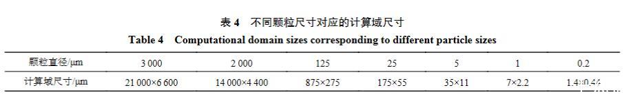 筆者為了將數值模擬結果與實驗結果進行對比驗證,在21 mm×66 mm的計算域內,設置了一個直徑為3 mm的顆粒,如圖2所示。筆者為研究不同尺寸樣本的碰撞行為,將根據顆粒大小對于數值模擬計算域相應的進行縮放。為便于模擬結果與前人的實驗結果進行對比,筆者將液滴?顆粒直徑比Ω均設定為1.31。詳細的各個顆粒尺寸下的計算域尺寸見表4。根據粉塵顆粒的尺寸對整個計算域進行等比例縮放,單元網格的幾何形狀、單元網格之間的關系以及網格質量都不會發生變化。因此計算域縮放前后不會造成模擬結果可靠度下降。
