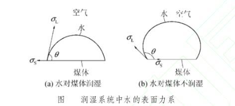式中,θ為水與煤表面的接觸角,它是指在固、液、氣三相交界處,自固-液界面經(jīng)液體內(nèi)部而到液-氣界面的夾角。如果接觸角θ<90°屬可濕潤(rùn)煤體,在相同的水表面張力系數(shù)條件下,θ角愈小,毛細(xì)作用力則愈大,增強(qiáng)了注水動(dòng)力,潤(rùn)濕能力愈大;若濕潤(rùn)邊角θ>90°屬于不可濕潤(rùn)煤體,θ角愈大,潤(rùn)濕能力愈小。