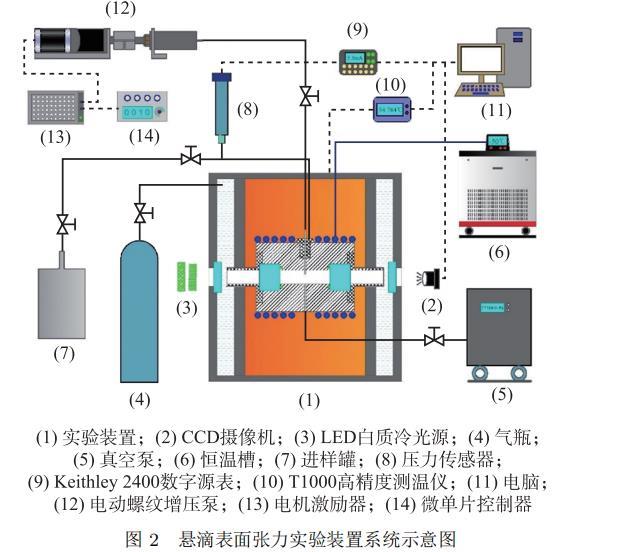 本文所搭建的懸滴法表面張力實(shí)驗(yàn)系統(tǒng)的溫度和壓力適用范圍為 223.15 ~ 373.15 K 和 0 ~ 15 MPa。實(shí)驗(yàn)系統(tǒng)示意圖如圖 2 所示,其主要包括實(shí)驗(yàn)裝置本體、恒溫槽、溫度控制與測(cè)量系統(tǒng)、氣體增壓與壓力測(cè)量系統(tǒng)、液滴控制系統(tǒng)、真空系統(tǒng)、圖像采集和數(shù)據(jù)處理系統(tǒng)。