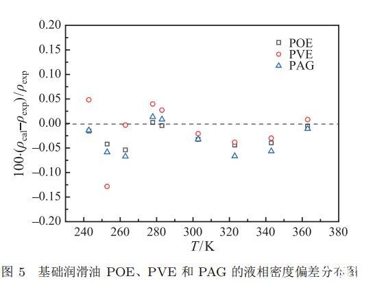 三種基礎潤滑油的液相密度隨溫度的變化趨勢如圖 4 所示,液相密度隨著溫度的增大而降低,且在同一溫度條件下,PAG 液相密度最大,POE 次之,PVE 最小。采用關聯方程計算的三種基礎潤滑油的液相密度與實驗測量值的相對偏差如圖 5 所示,其關聯方程計算值與實驗數據的相對偏差均在 ±0.2% 以內。